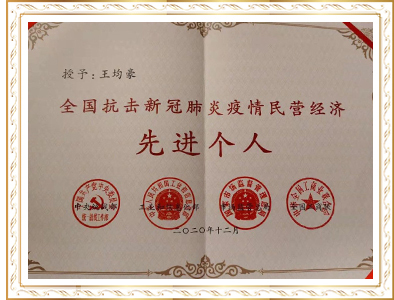 2020年王均豪荣获“全国抗击新冠肺炎疫情民营经济先进个人”称号